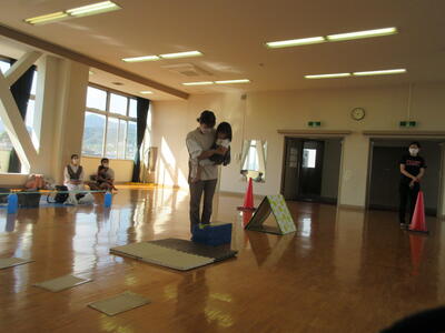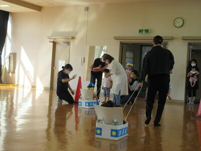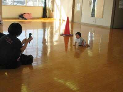 2歳児さんのサーキットは、1歳児さんより難しく。1本橋はカニさんになって進み・・・