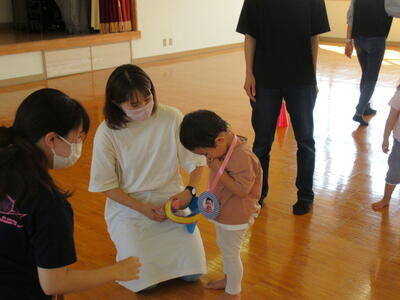 最後は簡単なゲームをしました。よーいスタートでぶら下がったプレゼントを取り、それを園長先生に渡すと・・・可愛くラッピングされたクッキーと交換です!