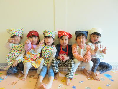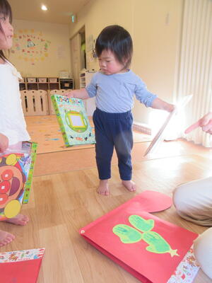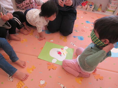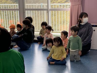 まずは、朝の会の歌をみんなで歌い、0,1歳児はお返事ハイ!をしました。2歳児さんは自分でお名前を言ってもらって質問にも答えてくれました。