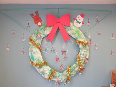 これは模造紙に皆でローラーを使って作ったリースです。そのまわりに星のオーナメントを作って飾ろう☆と親子でシールを貼ったり、ポスカでお絵描きしたり、2歳児さんははさみも使って素敵なオーナメントが出来上がりました☆