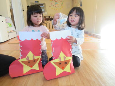 お昼寝から起きると、自分たちで作ったブーツの中にプレゼントが入っていました🎁
