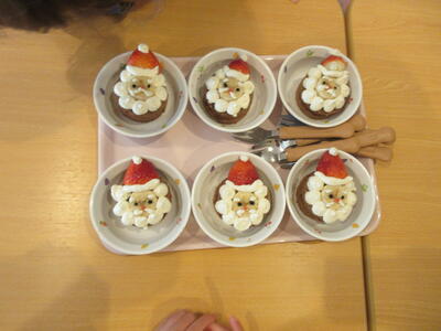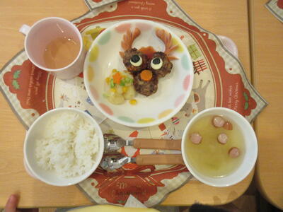 給食にはトナカイさんが!ポテトサラダのツリー🎄!おやつもサンタさん🎅のケーキで大喜びの子ども達でした!