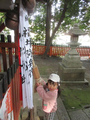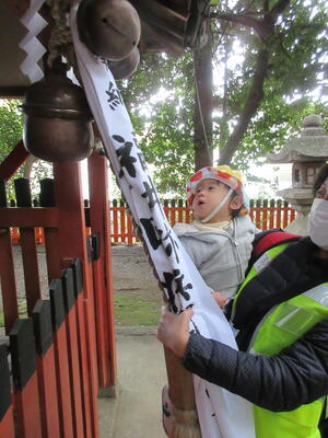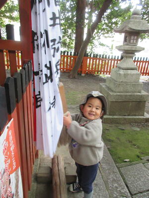 身を乗り出して、やりたい!と意欲的で、保育者に抱っこされながらいっしょにお参りしました。