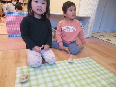2歳児さんはクリスマスプレゼントにもらったコマでコマ回しを楽しみました。コツをつかんですぐに回せるお友だち