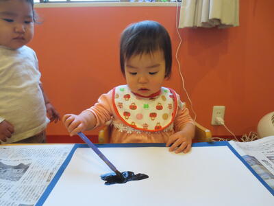 0歳児さんは筆を持つのが初めてでしたが初めてでしたが、ダイナミックに描いてくれました。