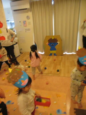 新聞紙で作った豆を鬼の絵に当てる的当てゲームを楽しみました☆