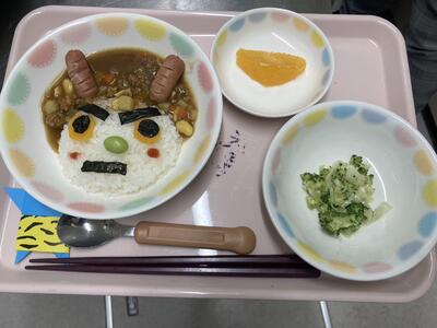 給食は なんと!鬼カレー 👹折り紙の鬼さんつきで美味しくいただきました。