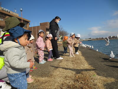 餌をあげると寄ってくるユリカモメの迫力にびっくりした子どもたちでしたが、冬ならではの